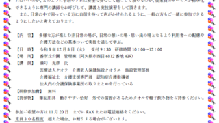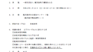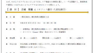 日々の仕事から少し離れ、ホッと一息できる時間として、フットケアセミナーのご案内です。・主 催 一般社団法人 鹿児島県介護福祉士会 鹿児島地区支部・日 時 令和5年12月2日(土) 18:00~19:00・場 所 各自のオンライン実施場...
