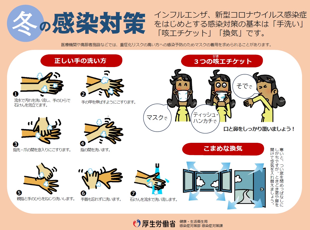 冬の感染対策について お知らせ 2025.01.10 インフルエンザや新型コロナウイルス感染症など、感染症の流行しています。改めて、日常における感染対策を確認しましょう。 冬の感染対策(厚生労働省ホームページより) 感染症情報 |厚生労働省