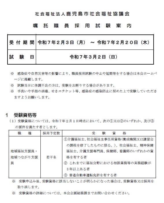 お知らせ社会福祉法人 鹿児島市社会福祉協議会 様から、嘱託職員採用試験のご案内です。