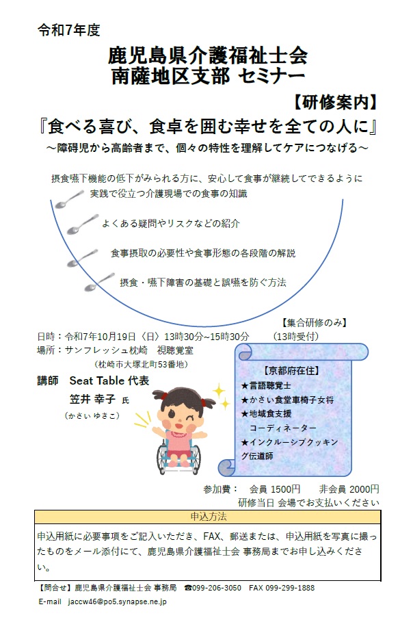 鹿児島県介護福祉士会 南薩地区支部では、「食べる喜び、食卓を囲む幸せを全ての人に ~ 障碍児から高齢者まで、個々の特性を理解してケアにつなげる ~」として、セミナーを開催いたします。