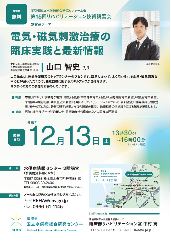 第15回 リハビリテーション技術講習会のご案内 お知らせ 2025.09.17 第15回 リハビリテーション技術講習会のご案内です。 お申込・お問い合わせは、「環境省国立水俣病総合研究センター 臨床部リハビリテーション室」までお願いいたします。 第15回 リハビリテーション講習会