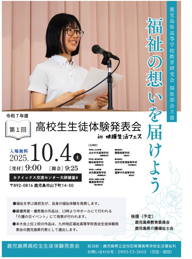 第1回 高校生生徒体験発表会in快護生活フェスのご案内 お知らせ 2025.09.17 「福祉の想いを届けよう」として、第1回 高校生生徒体験発表会in快護生活フェスが開催されます。 お問い合わせは「鹿児島県立加世田常潤高等学校 生活福祉科」までお願いいたします。 福祉の想いを 届けよう!第1回 高校生生徒体験発表会