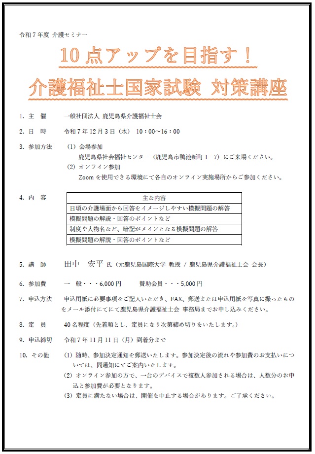 令和7年度 介護セミナー(介護福祉士国家試験 受験対策講座)のご案内 お知らせ 2025.10.17 「10点アップを目指す!介護福祉士国家試験 対策講座」として、介護セミナーを開催いたします。 主 催 一般社団法人 鹿児島県介護福祉士会 日 時 令和7年12月3日(水)10:00~16:00 実施方法 会場参加とオンライン参加のハイブリッド形式 開催要綱 介護セミナー(介護福祉士国家試験 対策) 申込書 申込書(国試対策)