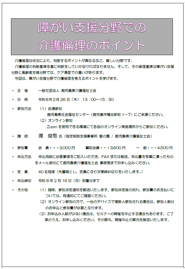 令和7年度 介護セミナー(倫理:障がい支援分野)のご案内 お知らせ 2025.11.26 「障がい支援分野での介護倫理のポイント」として、介護セミナーを開催いたします。 主 催 一般社団法人 鹿児島県介護福祉士会 日 時 令和8年2月26日(木) 13:00~15:30 開催方法 会場参加とオンライン参加のハイブリッド形式 開催要綱 倫理(障がい支援分野) 申込書 申込書(倫理:障がい分野)