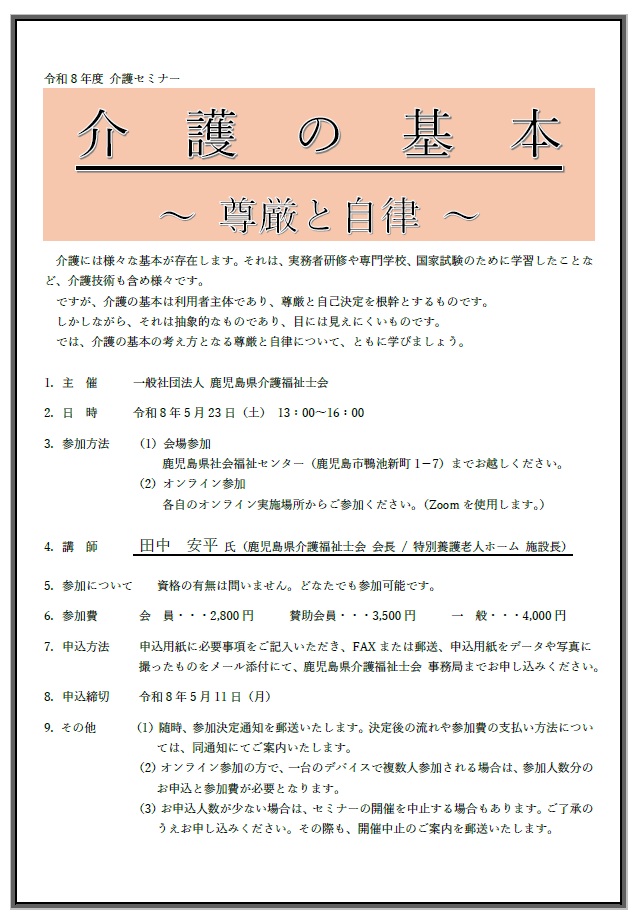 令和8年度 介護セミナー(介護の基本) お知らせ 2026.03.23 「介護の基本 ~ 尊厳と自律 ~」として、令和8年度 介護セミナーを開催いたします。 主 催 一般社団法人 鹿児島県介護福祉士会 日 時 令和8年5月23日(土) 13:00~16:00 開催方法 会場参加とオンライン参加のハイブリッド形式 開催要綱 介護の基本 申込書 申込書(介護の基本)