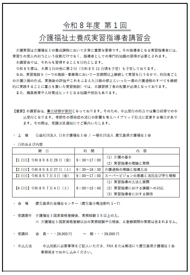 - 開催要綱 令和8年度 第1回 実習指導者講習会