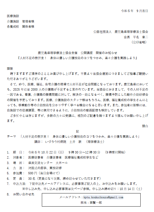 鹿児島県理学療法士協会 主催の公開講座のご案内 お知らせ 2023.09.27 鹿児島県理学療法士協会が主催する公開講座のご案内です。 お申込お問い合わせは、鹿児島県理学療法士協会までお願いいたします。 ➢ 理学療法士協会 公開講座